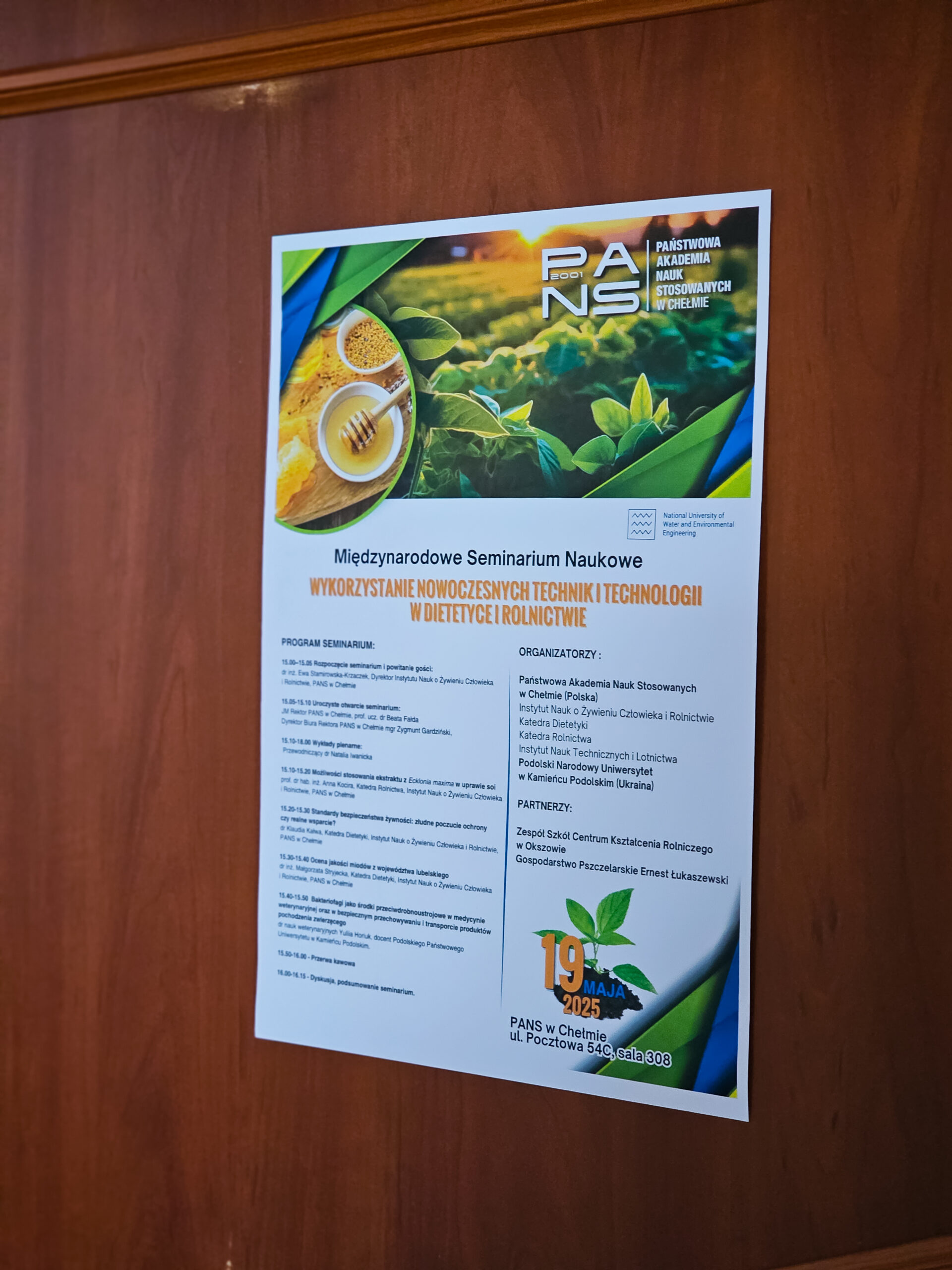 W dniach 17–20 maja 2025 r. w Państwowej Akademii Nauk Stosowanych w Chełmie odbyło się Międzynarodowe Seminarium Naukowe pt. „Wykorzystanie nowoczesnych technik i technologii w dietetyce i rolnictwie”. Wydarzenie zostało zorganizowane przez Instytut Nauk o Żywieniu Człowieka i Rolnictwie, Instytut Nauk Technicznych i Lotnictwa oraz Centrum Studiów Inżynierskich PANS w Chełmie, we współpracy z Zespołem Szkół Centrum Kształcenia Rolniczego im. Józefa Piłsudskiego w Okszowie oraz Gospodarstwem Pszczelarskim Ernesta Łukaszewskiego w Sarniaku.